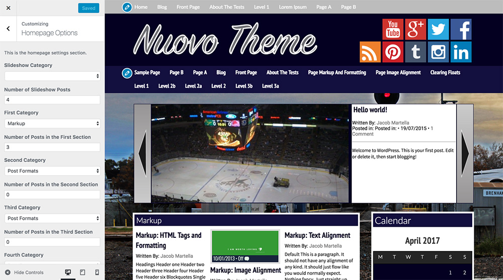 Nuovo gives the user almost complete control over the look and feel of his or her website. Users can select the color theme they want, what posts they want to show up in the homepage slider as well as in four separate areas on the homepage and can display the social media links they want in the header — all from the Customizer. Nuovo is also responsive, making it look good on any device with no extra work required.