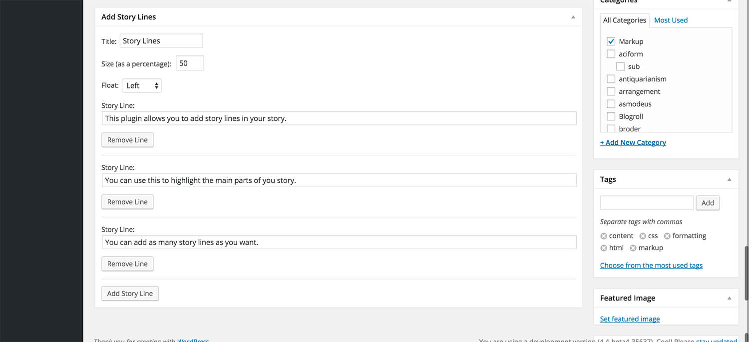 One of the common features of news stories is a section that displays two or three highlights from the story. This plugin makes it very easy to do just that. Story Lines allows you to add as many story lines as you want and place it anywhere in a post with a quick shortcode.