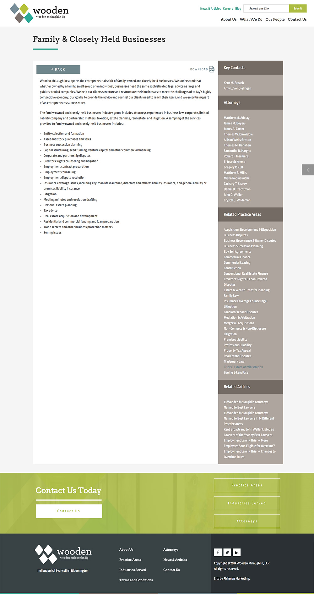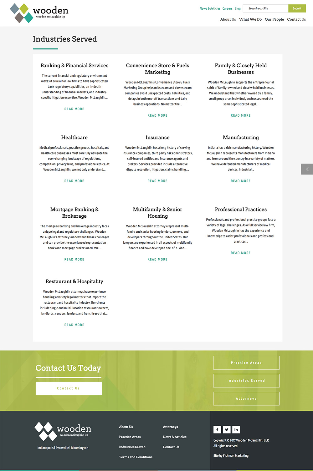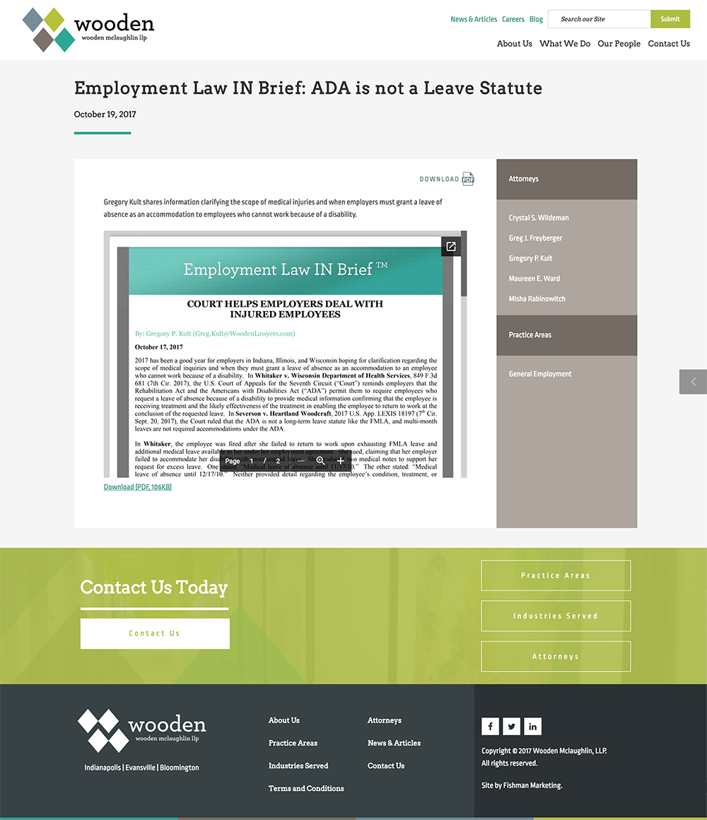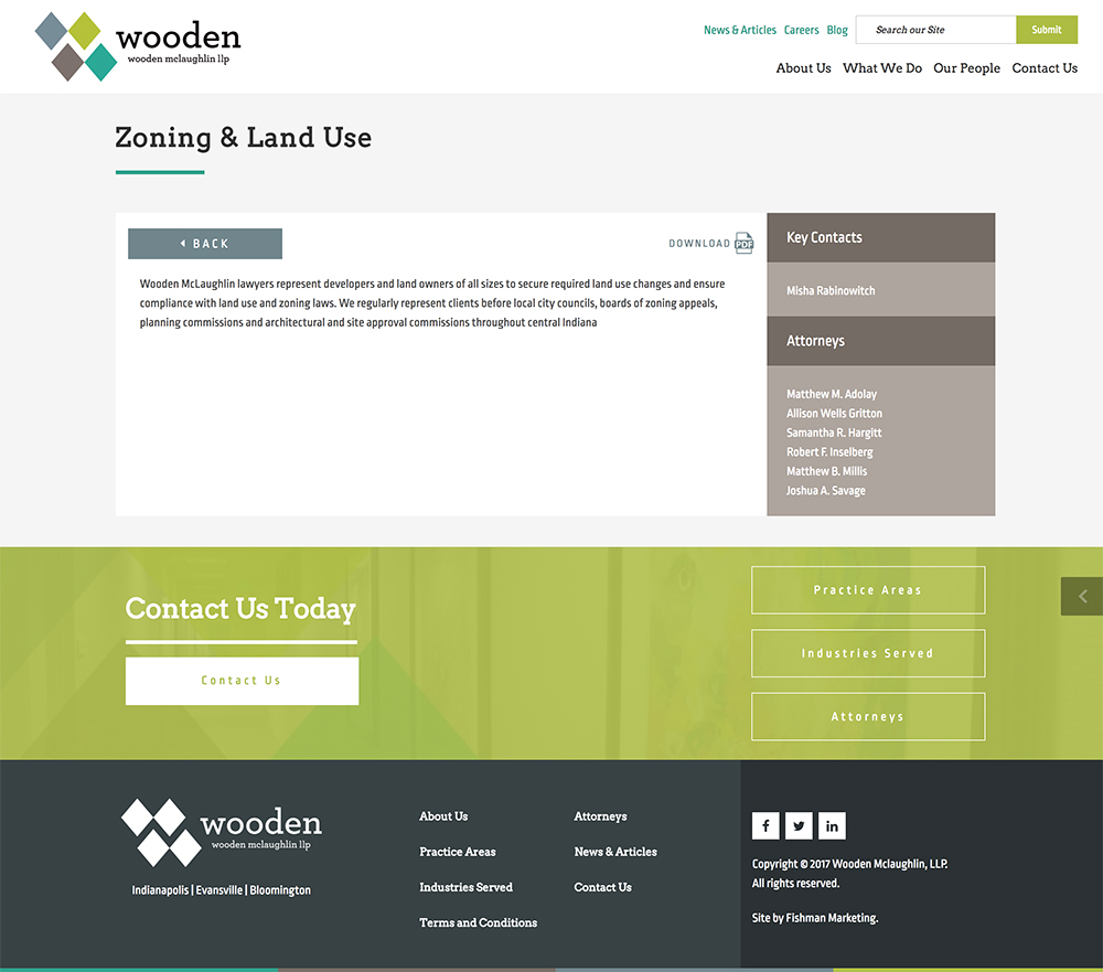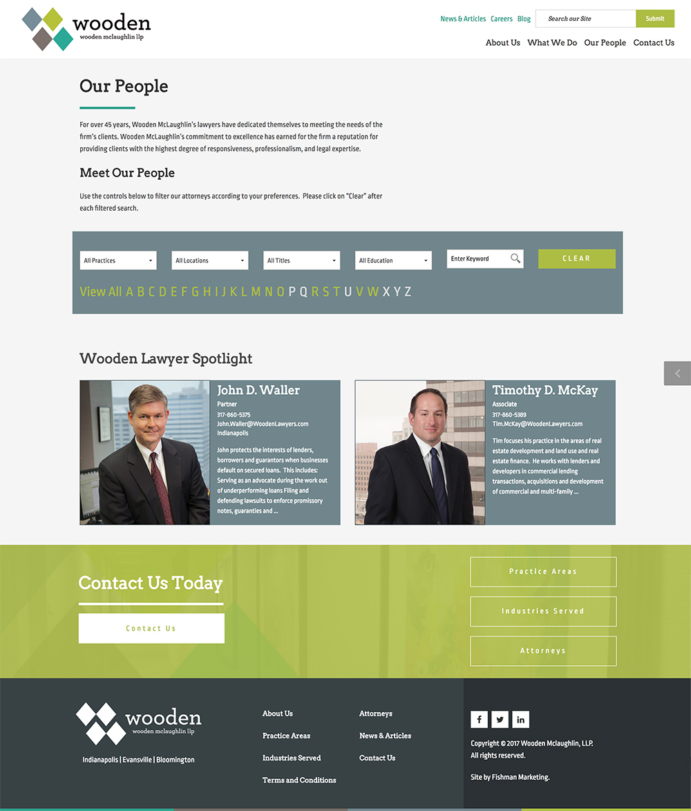 The other challenge was connecting the practices, industries served, lawyers and posts to each other. The practices, industries and lawyers were each their own custom post type and we used Advanced Custom Fields to add the relationships between all of them and the posts. The tricky part came in making those connections in the PHP code. Fortunately, WordPress’ custom queries helped in this case as we were able to pull posts in based off of the ids of the practices, industries and lawyers involved.